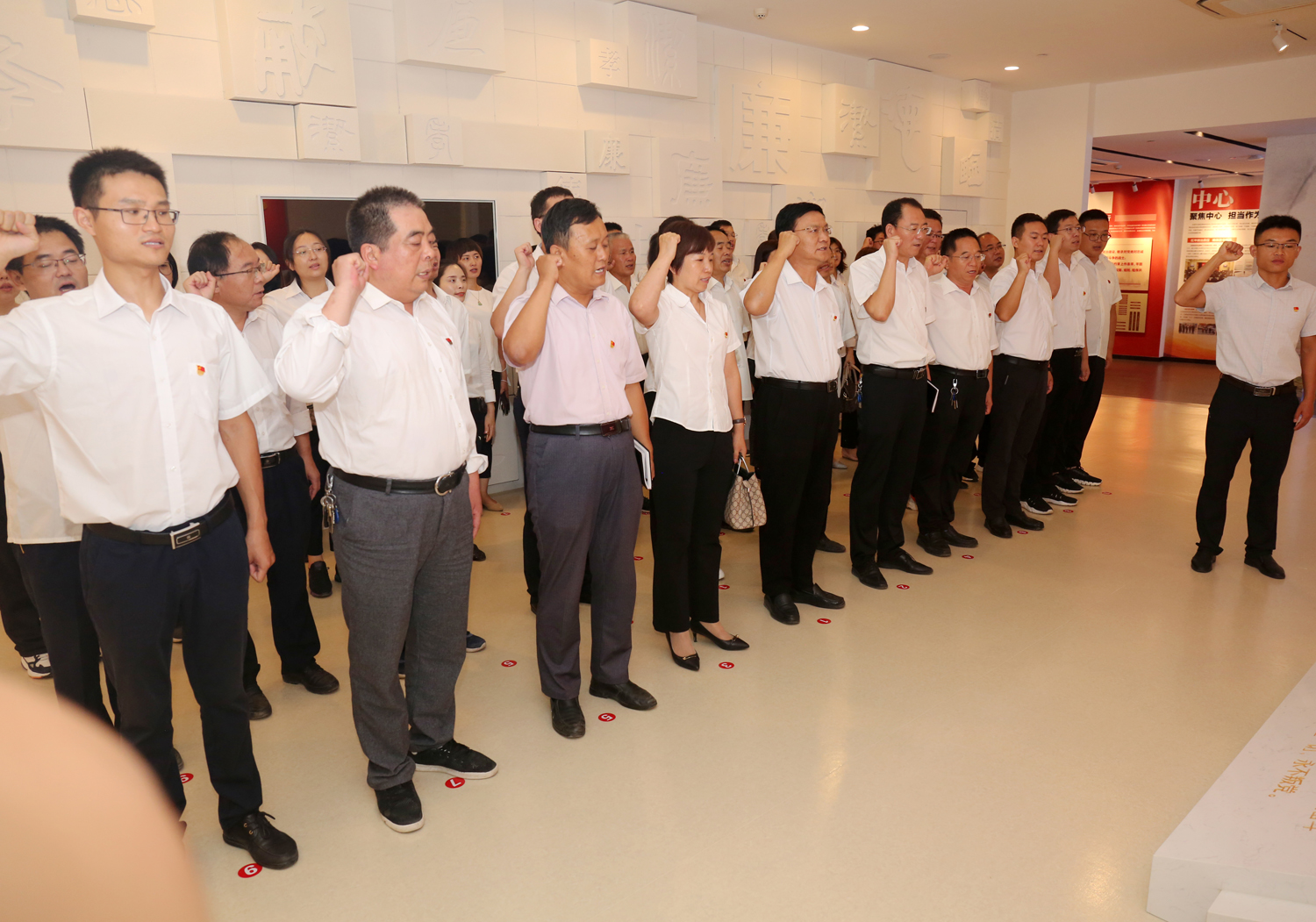 參觀結束后,全體黨員干部來到尾廳,面對鮮紅的黨旗莊嚴宣誓,用飽滿的熱情重溫了入黨初心。