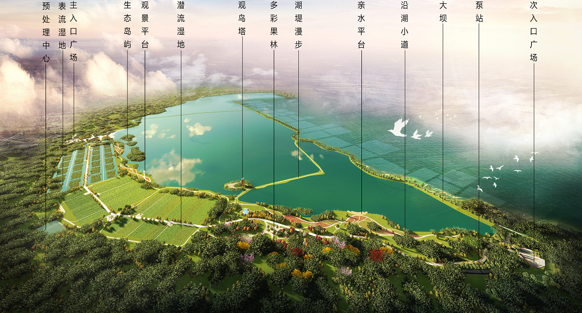 3、水生態(tài)工程:潛流濕地工程6h平方米;表流濕地人工濕地7.9 h平方米;綠化種植25.28h平方米,配套服務(wù)建筑共計(jì)1132.46平方米;修建環(huán)湖路10.932千米,次支園路6.580千米;場地鋪裝共計(jì)23127平方米;生態(tài)浮島、太陽能等原位處理工程;