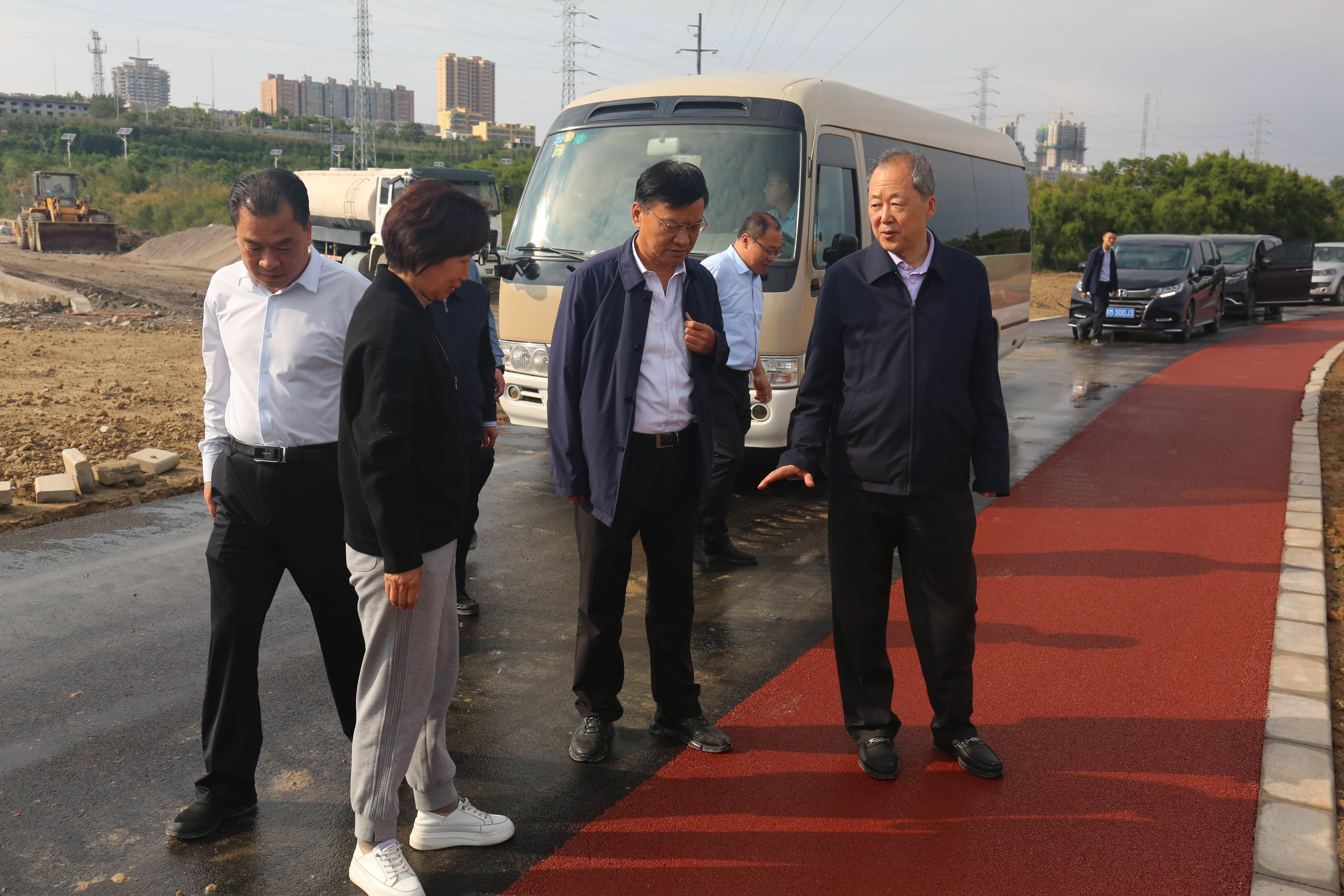 市委常委、副市長(zhǎng)董旭光在鹽湖堤埝整治及生態(tài)修復(fù)項(xiàng)目工地查看環(huán)湖路鋪設(shè)情況