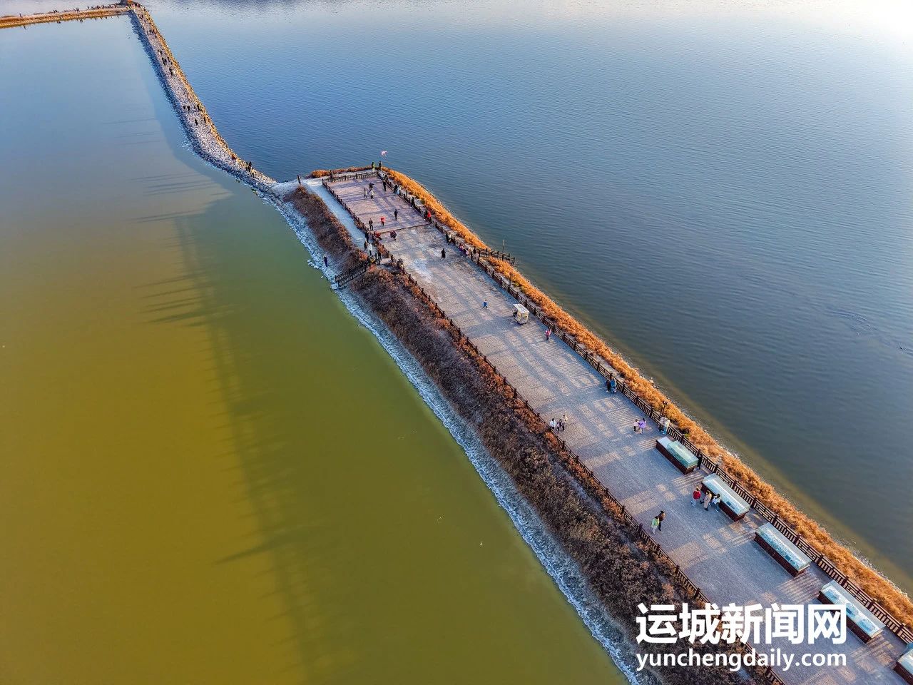 離開天鵝棲息地后,不一會(huì)就來到了新修建的親水觀光木棧道附近。它位于鹽湖最東側(cè)區(qū)域,緊臨鴨子池大壩,是鹽湖堤埝除險(xiǎn)加固及生態(tài)修復(fù)項(xiàng)目一期的主要建設(shè)內(nèi)容之一,長(zhǎng)度約3公里,沿途設(shè)有3個(gè)親水平臺(tái)和休憩節(jié)點(diǎn)。行走在木棧道上,可以近距離感受鹽湖美景,尤其是夕陽西下時(shí),在落日余暉的映襯下,鹽湖與木棧道一起,構(gòu)成了一幅非常有氛圍感的畫卷。