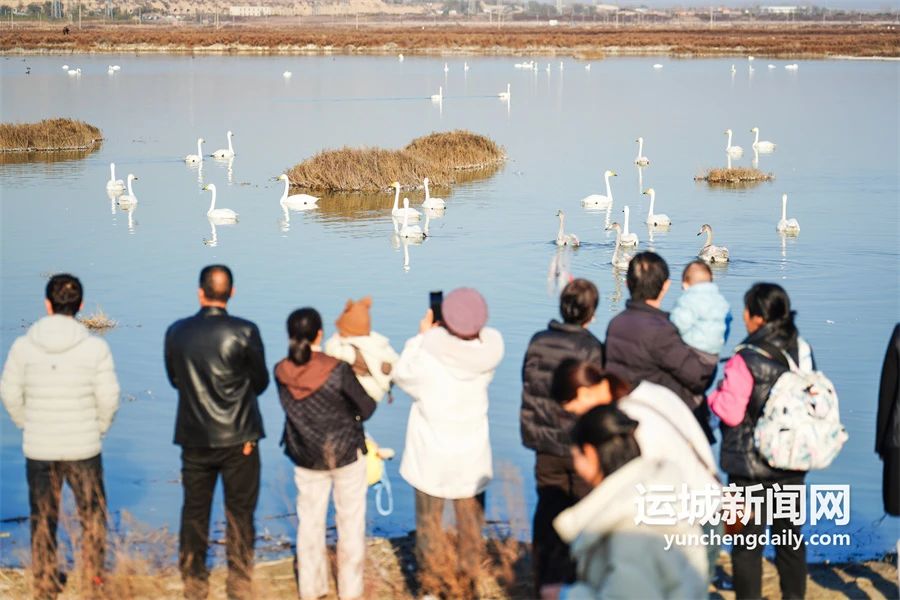 游客們七嘴八舌,顯得十分開心。經(jīng)過十幾分鐘的行駛,小火車便到達(dá)了天鵝棲息地。在那里,成群結(jié)隊(duì)的天鵝在水中或玩耍嬉戲,或展翅飛翔,或低頭覓食,為鹽湖帶來了勃勃生機(jī),惹得游客驚嘆連連,不斷拿起手機(jī)記錄拍照,一幅人與自然和諧相處的畫面。